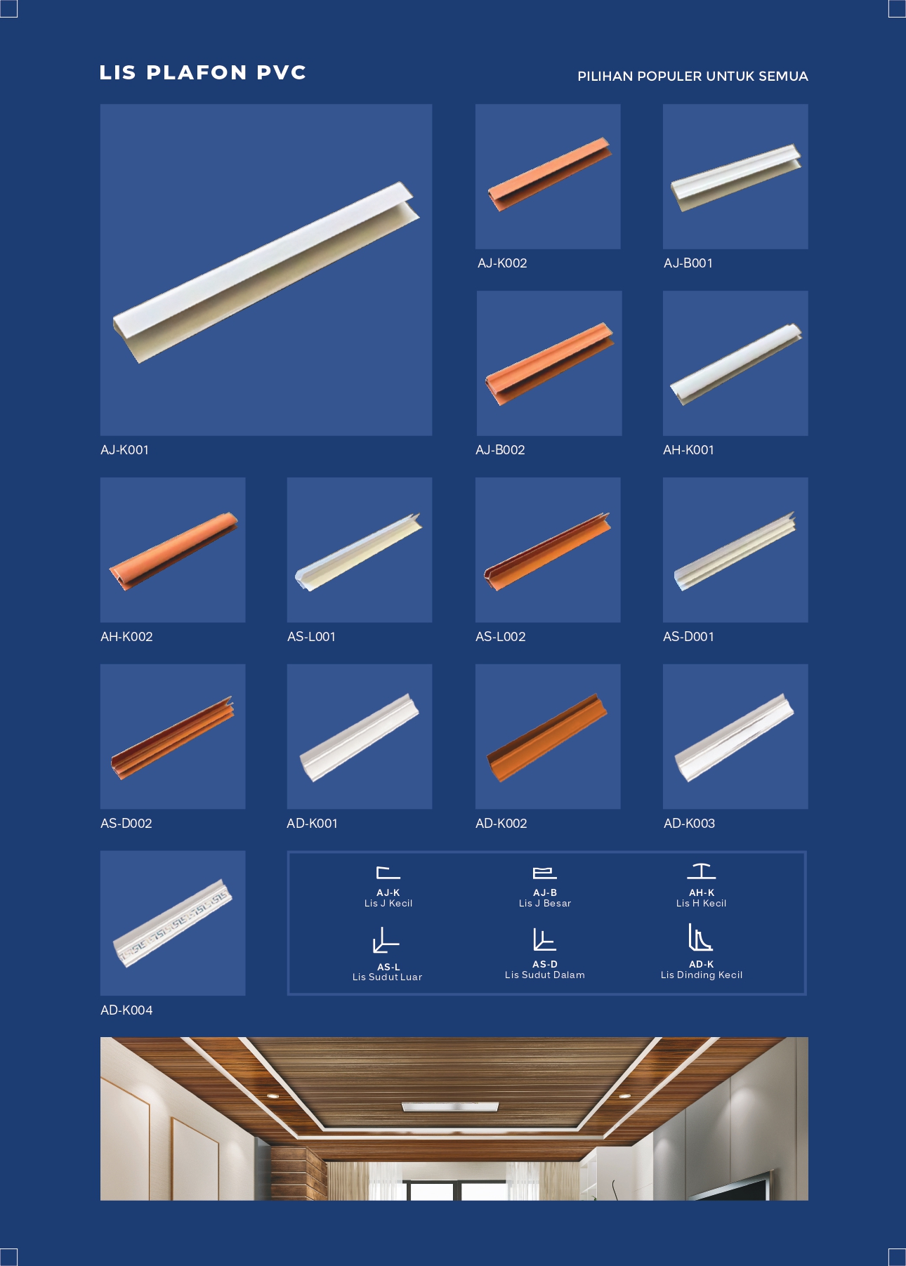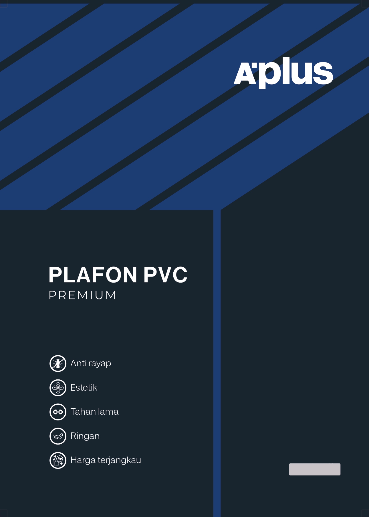 Plafon PVC Aplus diformulasikan dengan material terbaik guna menghasilkan produk yang tahan air, rayap, serta tidak rambat api. Pemasangannya menggunakan interlocking system sehingga hemat waktu dan mudah untuk dibongkar pasang.